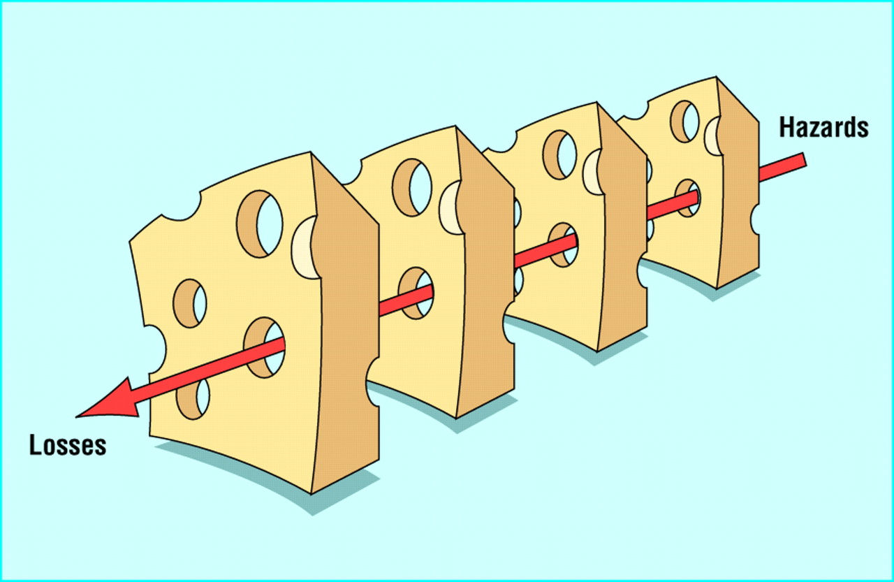 Thus far, we’ve evaluated a precaution independently from each other. In fact, however, accidental errors often arise because multiple precautions failed to prevent the accident from occurring. Reason (2000) depicted this as a “Swiss cheese” model of accidents, where each of multiple precautions reduces accident probability, but not completely, such that accidents pass through it (Figure 5).
